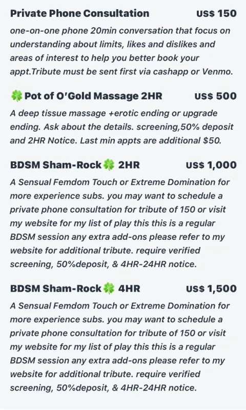 Must be deposit ready via cashapp,Venmo,ApplePay,Zelle or PayPal 🍀Pot of O’Gold Massage 500 2HR A deep tissue massage +erotic ending or upgrade ending. Ask about the details. BDSM Sham-Rock🍀 1000 2HR A Sensual Femdom Touch or Extreme Domination for more experience subs. Schedule a private phone consultation for tribute of 150 to discuss my do’ s and dont’s. PLEASE NOTE: I do not reply to incomplete text messages(ie “Hi” “Available” etc). I will just blocked ur number. Don’t Be A Timewaster Thanks!